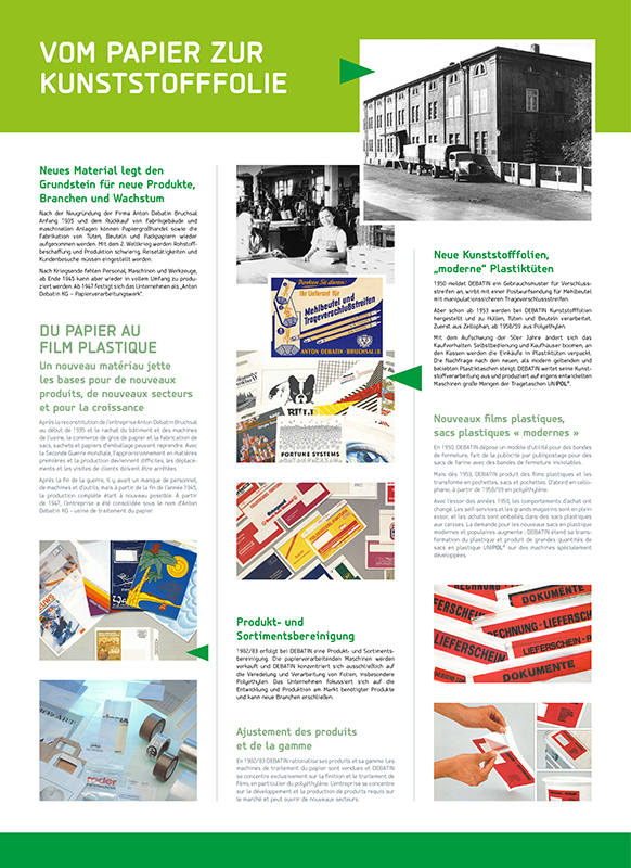 En 1923, Anton Debatin et Rudolf Berger ont fondé la “Papiergesellschaft Debatin & Berger, Bruchsal”. Le premier établissement : une ancienne écurie. Activités principales : commerce de papier, imprimés occasionnels, impression de papiers pour la fabrication de sacs et de sachets, de papiers d’emballage, d’enveloppes et de papiers cirés.