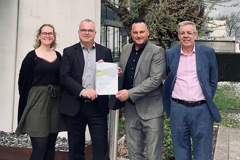 Les collaborateurs et collaboratrices de Doneck Euroflex S.A. font tellement bien les choses que nous venons de les élire « Sustainability Champion ». Nous sommes fiers de nos fournisseurs, alors pourquoi ne pas le montrer ? Denise Raupp (tout à gauche), Hans-Walter Trepper (tout à droite, tous deux de DEBATIN), Edgar Becker et Meikel Meier (Doneck) sont tous ravis de cette distinction. 👍 BRAVO !