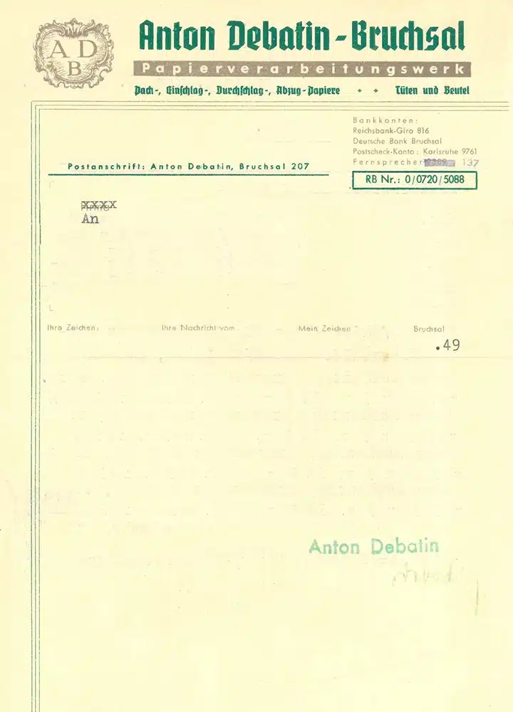 C’est probablement pour cette raison qu’Anton Debatin, après les premières années et avec la création d’Anton Debatin Bruchsal en 1935, opte pour une sorte de blason qui représente l’entreprise et qui est par exemple reproduit sur le papier à lettres. L’original du blason d’ADB, qui faisait alors partie du vitrage d’une fenêtre dans un bureau de la Schnabel-Henning-Str. 34 à Bruchsal, est encore conservé aujourd’hui. La police de caractères choisie est une police “brisée” Fraktur-Grotesk. Les polices brisées / Fraktur sont également utilisées en typographie depuis l’invention de l’imprimerie et comptent parmi les polices d’impression les plus utilisées dans les pays germanophones depuis le milieu du 16e siècle jusqu’au début du 20e siècle. L’exemple le plus connu : la Bible de Gutenberg.