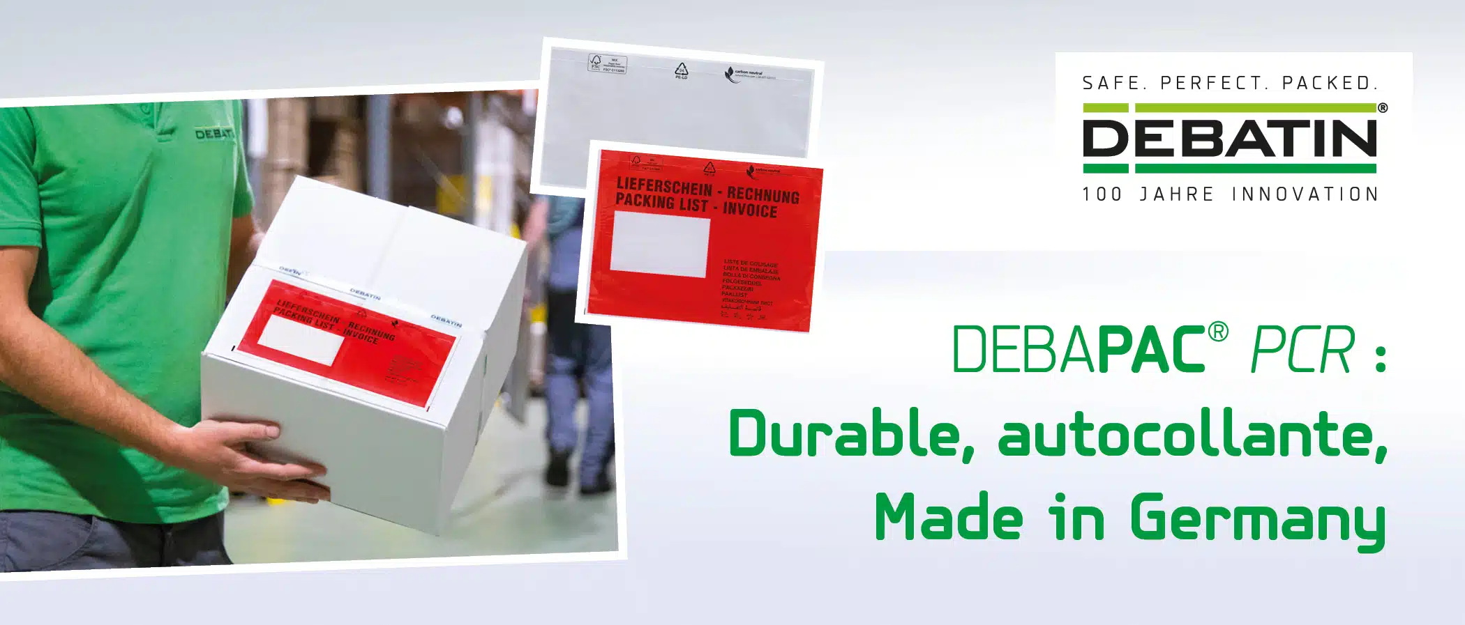 Nous voulons être globalement durables. C'est pourquoi nous remplaçons dès maintenant nos pochettes porte-documents DEBAPAC®, qui ont fait leurs preuves des millions de fois, pour l'envoi de factures, de bons de livraison, de documents d'accompagnement de fret, de modes d'emploi et bien d'autres choses encore, par la nouvelle pochette porte-documents [...]