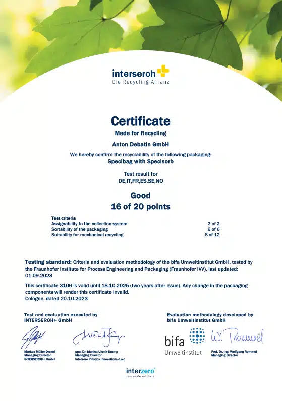 L’alliance de recyclage interzero confirme que notre solution d’emballage DEBAMED® Speci-Sorb est non seulement très intelligente, mais aussi durable. DEBAMED® Speci-Sorb a ainsi reçu le certificat « Made for Recycling », et la note de 16/20 nous a permis de décrocher la mention « Bien ». Ce certificat a également été attribué à nos Specibags sans Speci-Sorb (18/20). La méthode d’évaluation a été développée par l’institut environnemental bifa et est contrôlée par l’institut Fraunhofer spécialisé dans le génie des procédés et les emballages. Notre clientèle (potentielle) du secteur des laboratoires est tout aussi ravie que nous : 40 % des laboratoires allemands estiment en effet que l’importance de la durabilité est élevée à très élevée !